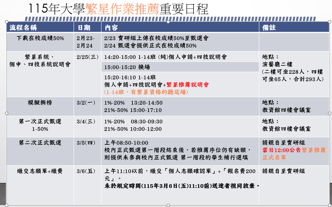 | 個人申請入學二階面試 | 114/5/15~114/6/1 |